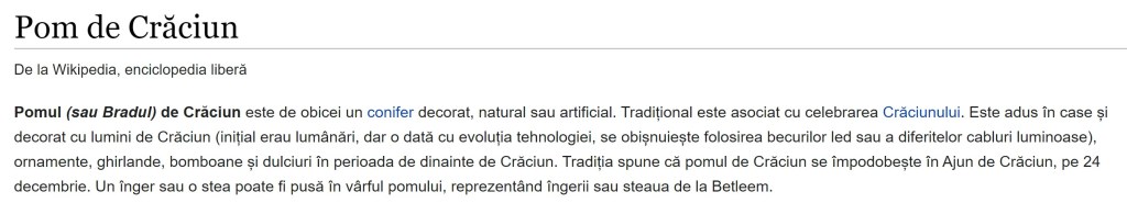 Am căutat pe Google întăi „tradiția împodobirii bradului” și nu am găsit mare lucru. Pe prima pagină sunt aceleași articole copiate de la unii la alții. Nimeni nu se uită pe pagina a doua. Ceea ce am învățat este că tradiția împodobirii bradului în România a pornit în palatul regelui Carol I de Hohenzollern, în anul 1866, iar de atunci românii au preluat această tradiție (sursă).