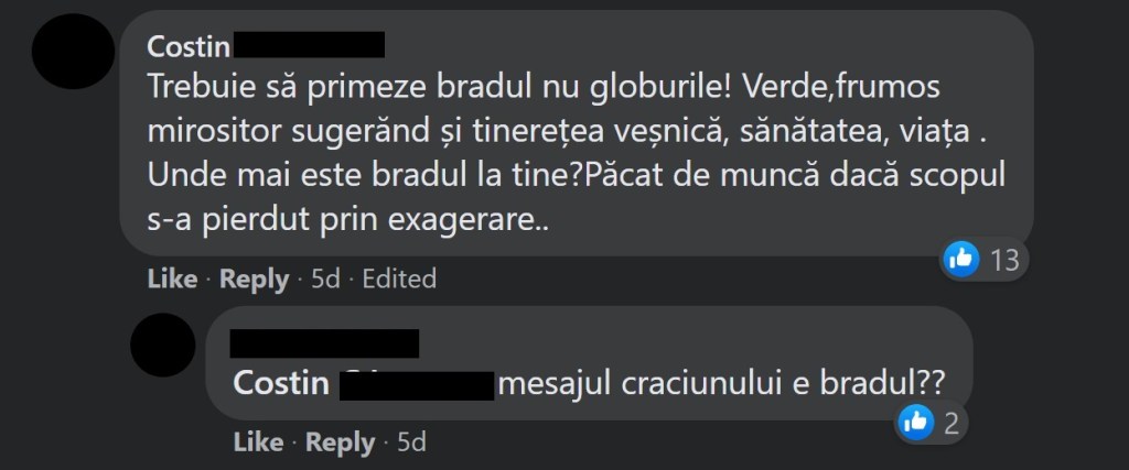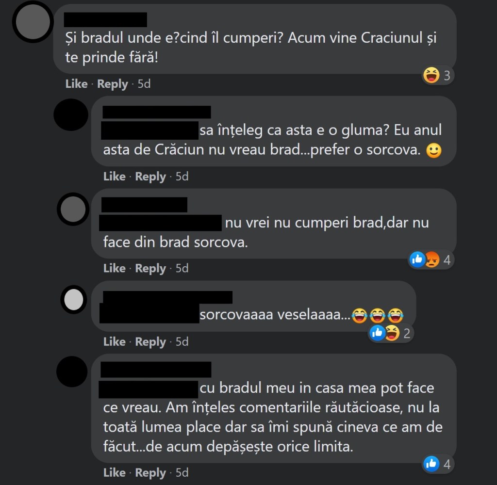 Știți cum e aia cu capra vecinului? Vă arăt mai jos niște exemple de comentarii ale românilor de pe un grup de Facebook cu aproximativ 500 000 de membrii (toate de la postări cu brazii de Crăciun de anul ăsta).