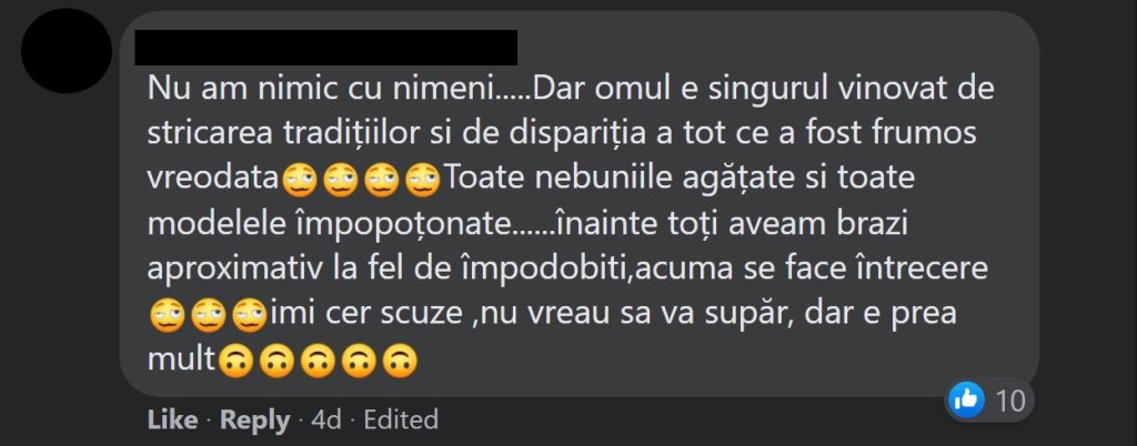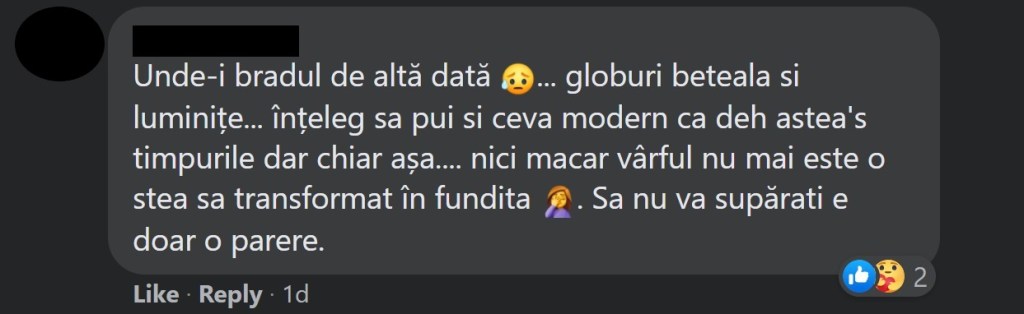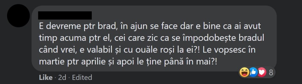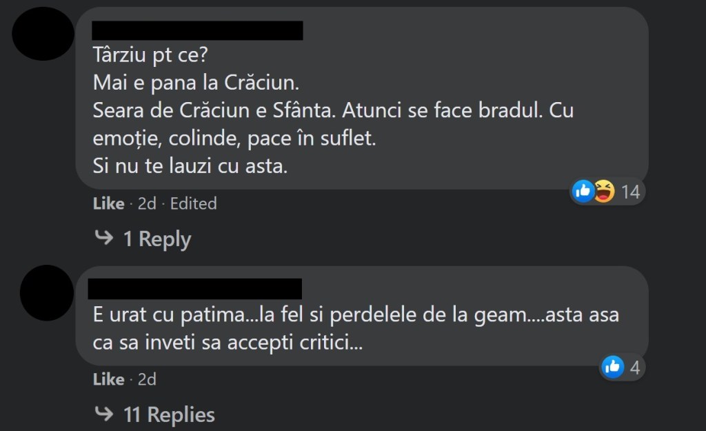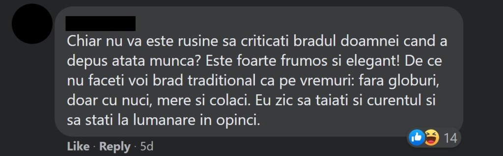Mă bucur să văd că și-au găsit o ocupație pe timp de pandemie. Dar știți cum e românul… tot timpul trebuie să se plângă de ceva. Ba nu e frumos, ba e prea mult, ba pomul e făcut prea devreme, ba „nu e așa tradiția”, etc.